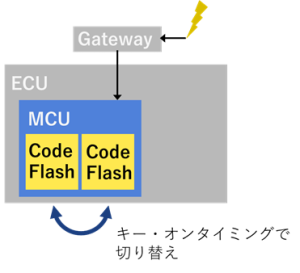 MCU内蔵のフラッシュ・メモリを2つの領域に分け、一方をMCUのCPUから命令フェッチ可能な領域、もう一方を書き換え可能な領域としておきます。アプリケーション・ソフトウェアの動作中に、書き換え可能な領域の方に新しいソフトウェアをダウンロードしておきます。自動車のキー・オンのタイミングで2つの領域を入れ替え、ダウンロードした新しいソフトウェアでMCUが動作を開始します。