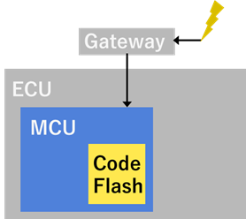 車両停止中(ECUのアプリケーション・ソフトウェアが動作していない時)に、新しいソフトウェアのダウンロードを行い、MCU内のコード・フラッシュ・メモリを書き換えます。コード・フラッシュ・メモリが一つしかないため、ECUの動作中にはダウンロード、書き換えができません。
