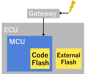 MCU内蔵のフラッシュ・メモリとは別にフラッシュ・メモリをMCUに外付けしておき、MCUのアプリケーション・ソフトウェアの動作中にも新しいソフトウェアをダウンロードできるようにした方式です。車両停止中に、外付けのフラッシュにダウンロードしておいた新しいソフトウェアをMCUのコード・フラッシュに書き込みます。