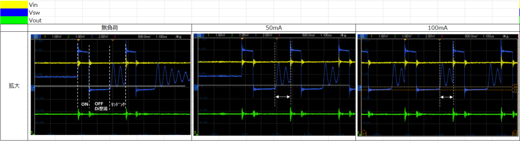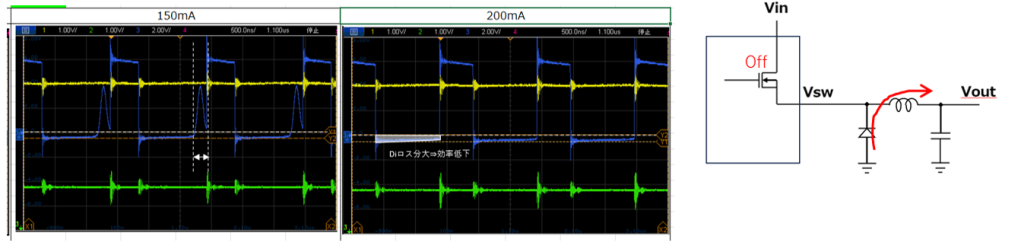 負荷電流が大きく成るにつれリンギング時間が短くなっていき、150~200mA付近でリンギングが見えなくなり、完全な連続モードに切り替わります。これ以降負荷電流を流しても、ハッチ部全てダイオードロスとなるため、効率上昇は望めず、効率が低下します。このことからリンギングがなくなる150~200mA付近で効率ピークとなり、これは効率カーブの結果とも一致することが確認できました。