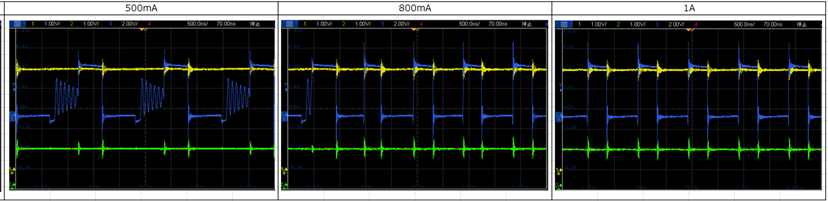 800mA付近でリンギングがなくなり、ほぼPMWと同じ連続パルスに切り替わっています。今回測定はしていないですが、PFM/PWM自動切換モードがあれば、PFMとPWMの効率のトップを取るようなポイントでモード切換えするのが理想と想定されます。
