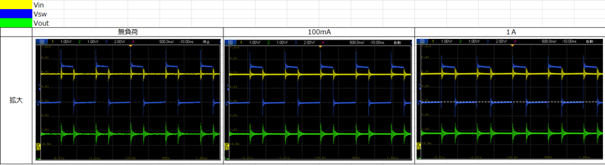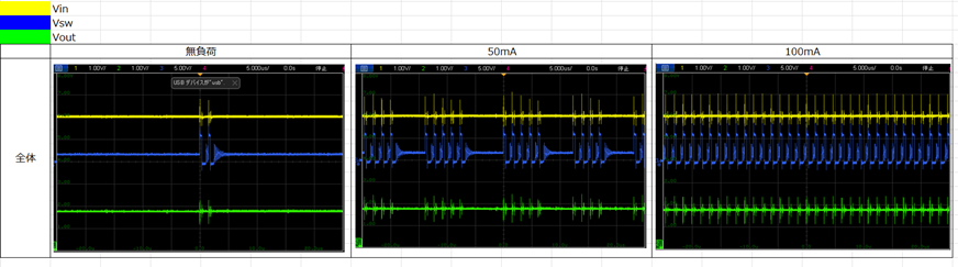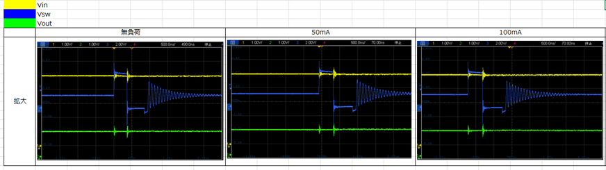 またオシロスコープで負荷電流ごとVin、Vout、Vswを測定・考察しました。