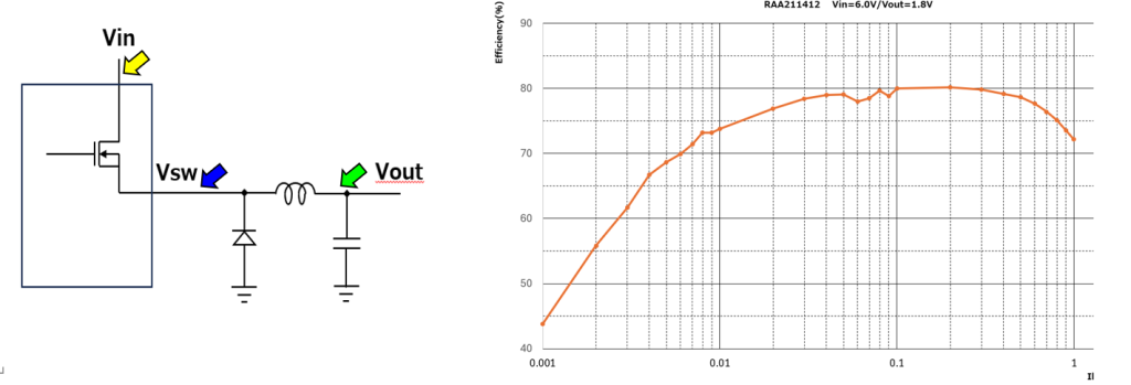 上図からわかるように軽負荷時(10mA以下)の効率が悪く、負荷電流が増加するにつれ、効率が上昇していきます。