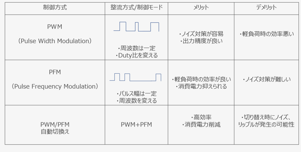 上図から負荷電流の増加とともにスイッチング回数が増加していることが確認できます。負荷によってスイッチング回数が変化するので、無駄なスイッチング回数が減り、スイッチング損失が低減され全体的な効率が向上することが確認できます。波形は、非同期整流に似ていますがローサイドのOn時のダイオードロス分が無いのでより高効率になります。