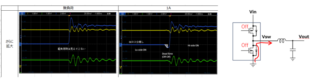 上図は無負荷時と1Aを流した波形をさらに拡大した図となります。ローサイドON→ハイサイド ONの間にデッドタイムが確認出来ます。この区間だけボディダイオード経由で電流を引いている。非同期整流と比較すると、ロス分はデッドタイムのボディダイオード部分だけで、 ローサイド ON時のダイオードロス分が無いのが確認できます。こちらが高負荷側で高効率が実現出来ている要因であると考察できました。