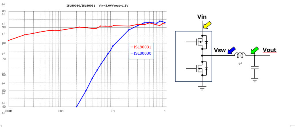 簡単な回路図が下左図となり、各負荷電流におけるそれぞれVin、Vout、Iinを測定し効率を計算しました。