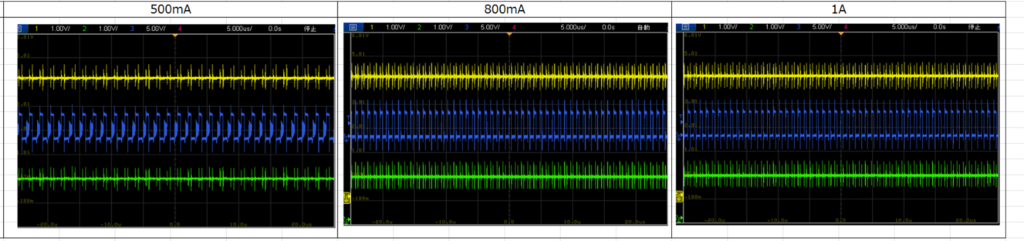 そしてIout=0.1A~0.2A程度でピークを迎え,それ以降は効率が下降していくのが分かりました。波形からも負荷電流が増加するにつれて、スイッチング回数が増加しているのが分かます。