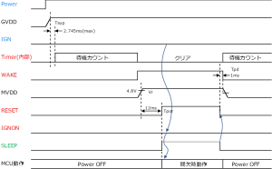 ・WAKE信号生成部はMCU用電源ICの出力を制御します。IGN=Low時、間欠動作として1s経過すると