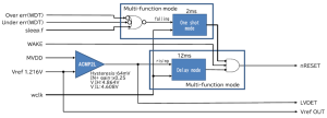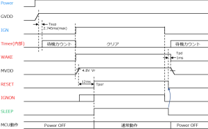 ・RESET信号生成部はMCUのnRESET端子を制御します。WAKE=High時、MVDDが所定の電圧になると