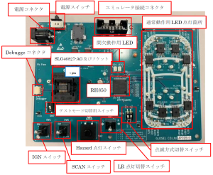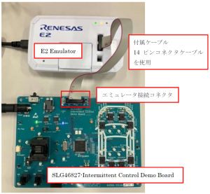 ・エミュレータ接続コネクタにE2エミュレータなどをケーブルで接続することでMCUデバッグやデータ書き換えが可能です。