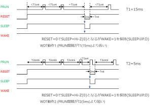 ・WDTnRESET=High中に動作します。15ms以上MCUからPRUN信号のHighパルスがない場合、