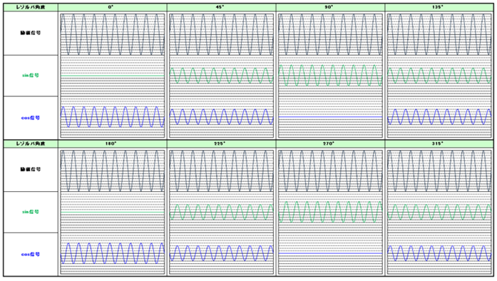 【シャフトの角度と励磁波、正弦波(sinθ)、余弦波(cosθ)】
