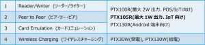 Reader/Writer (リーダー/ライター)・Peer to Peer (ピア・ツー・ピア)・Card Emulation (カードエミュレーション)の3モードをサポートする製品としてPTX100R・PTX105R・PTX130Rがあり、電力のやり取りのみを行う製品としてPTX30W・PTX130Wがあります。