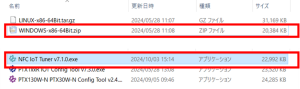 今回のデモ環境はwindowsですのでwindows用zipファイルを選択すると、3種類のソフトウェアツールが確認されました。このうち「NFC IoT Tuner v7.1.0.exe」を使用します。