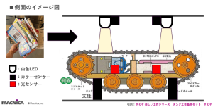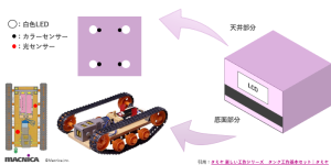 筐体の上部に白色LEDに隣接させてカラーセンサを配置し、底面部分には自動搬送で使用するタンク工作キットを配置しています。工作キットの部分に光センサを2つ配置し、天井部分のLEDの光を読み取る構造にしました。