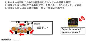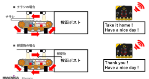 判定の結果がチラシであればモーターを逆転させて、チラシを投函者へ返却し、郵便物であればモーターを正転させて投函ポストへ投函します。LCDにはそれぞれ異なる表示をし、micro:bitでそれぞれ音を鳴らします。