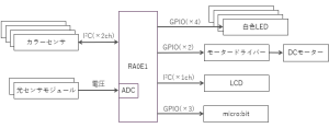 カラーセンサとLCDはI2Cを用いて通信を行い、光センサモジュールからは電圧を取得し、その他はGPIOを用いて制御を行いました。今回使用するカラーセンサはスレーブアドレスを2つ選択できるため、I2Cは2ch使用しています。
