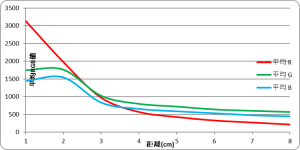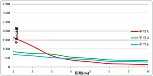 以下は距離1cm、LED1個で赤色を測定した際のグラフになります。縦軸が平均RGB値(2回測定したため)を示し、横軸はカラーセンサと測定物の距離を示しています。グラフより、1cmに近いほど、有効なRGB値が取得できていることがわかります。