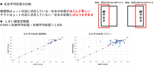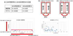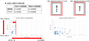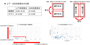 以下は、横軸が紙面左右の色の明るさの差分、縦軸が紙面左右の色鮮やかさの差分を示しています。左の郵便物のグラフは、左右彩度差分が0.05以下にデータが集中しています。こちらのグラフも郵便物の方が分散が小さい結果となりました。