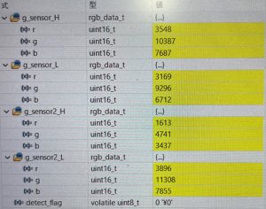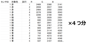 具体的には、4つのカラーセンサで赤・緑・青のコピー用紙をそれぞれ5回測定し、各カラーセンサにおける赤・緑・青の平均値を算出しました。以下の画像はセンサID1での取得結果になります。これを、4つのカラーセンサ全てでRGB値の取得を行いました。その後、1つのカラーセンサを基準として選択し、基準のカラーセンサに合わせる形式で他のカラーセンサのRGB値を倍率補正することで校正を行いました。