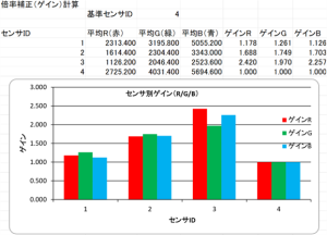 最終的な測定結果は以下になります。特に、センサID2・ID3とセンサID4に大きな乖離があることがわかります。今回はセンサID4を基準に設定し、下記表のゲインに従って各センサの倍率補正を行いました。