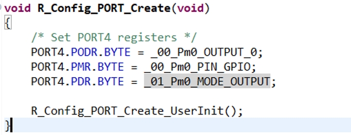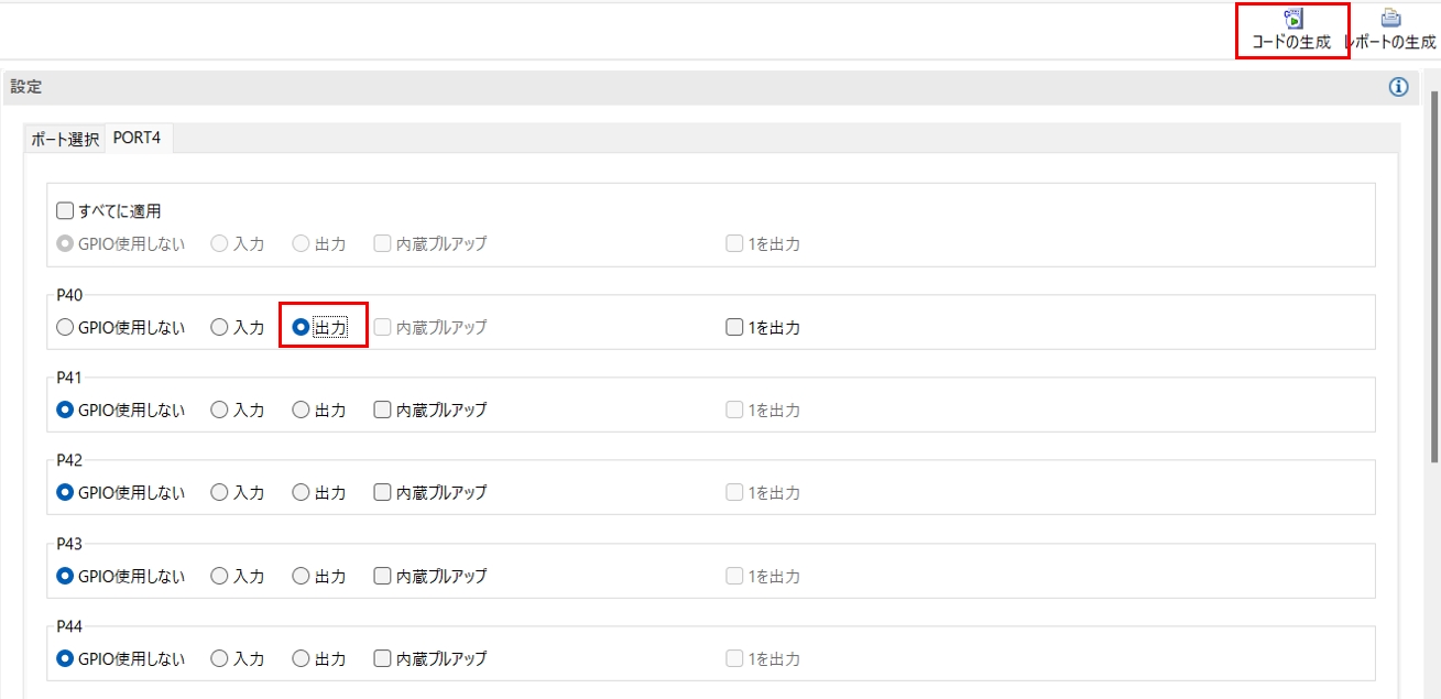 「Config_PORT.c」が生成され、 P40が出力ピンである旨のコードが書き込まれたことが確認できます。