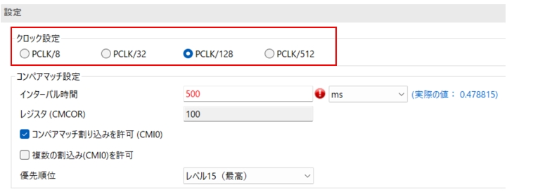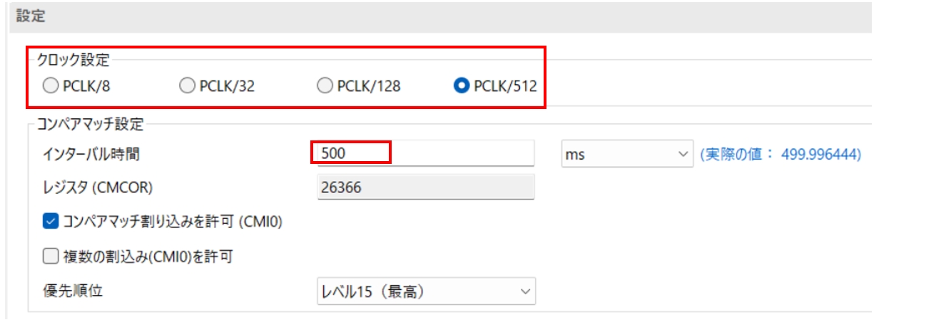 今回はPCLK /512で設定すると、500ms程度のインターバル時間になりました。