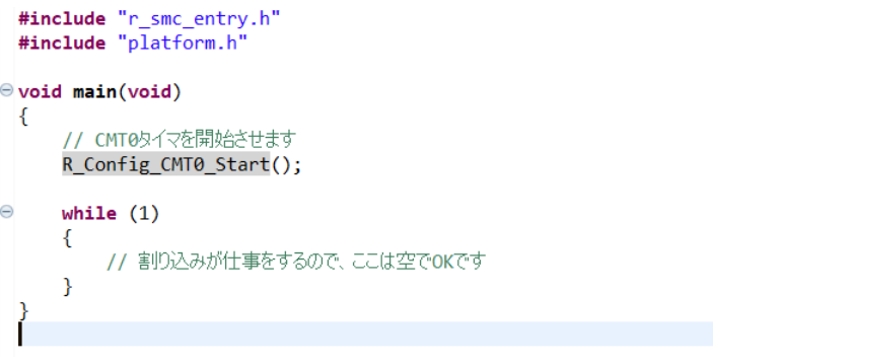 「#include “r_smc_entry.h”」と「#include “platform.h”」については、以下URLの内容をご参照ください。