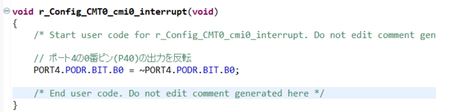 「PORT4.PODR.BIT.B0 = ~PORT4.PODR.BIT.B0;」こちらは、最初に設定した出力ポートP40