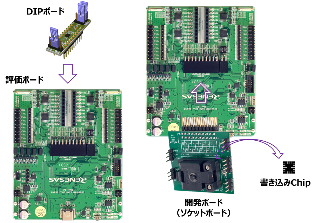 こちらも評価ボードと接続することで搭載型番をすぐに評価可能です。同じくEmulationでの動作確認も可能です。ソケットタイプなので、書き込んだICを取り外しお客様の基板に実装しての評価が可能になります。