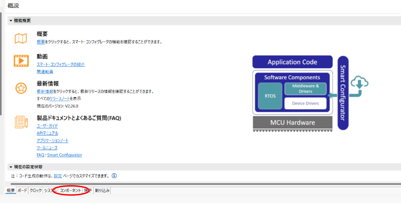 2.ファイルを開くと以下の画面が表示されますので、画面下側赤枠の「コンポーネント」タブをクリックします。