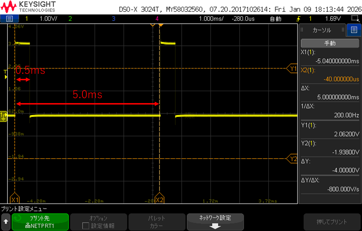 設定したとおり周期5.0msに対してON時間0.5msとなっておりDutyが10%であることが確認できました!