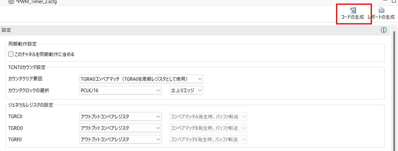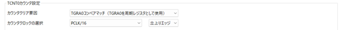 1周期の長さを決めるため、設定値に到達した時点でカウンタを『0』に戻す設定です。本ガイドでは、周期設定用のコンペアマッチレジスタとして TGRA を使用します。