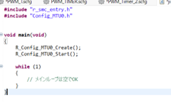 「#include “r_smc_entry.h”」は、スマートコンフィグレータが自動生成した、マイコンの初期設定を読み込む為のコードです。