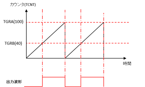 MTIOC0A端子は、解説図における**「出力波形」**に該当します。この設定により、周期の始まり(カウンタ0)でLow(0) を出力し、周期の終わり(TGRAとの一致時)に再び Low(0) を出力して次の周期へ備えます。