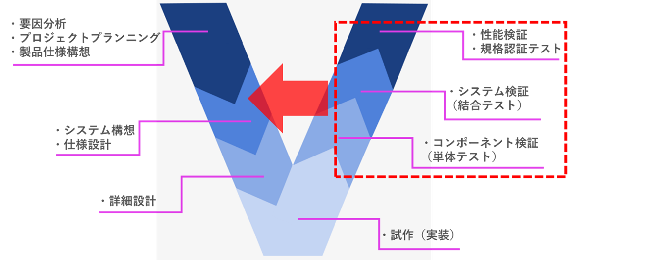 シフトレフトとはソフトウェア開発におけるテスト工程を開発の上流(V字の左側)に寄せることで、より早い段階で仕様バグなどの問題を発見し、修正することにより、以降の工程での不具合の修正や仕様の作り直し等を減らすことで、全体としての開発効率と品質を高めることを目的とした開発手法となります。