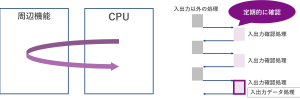 CPUから周辺機能へ入出力状態の定期的な確認処理を実行し、入出力が確認できたら、決められたデータの処理を行います。
