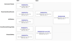 RH850/F1LやF1KなどRH850 Gen1は主に単体ECU向けに利用され、一方で RH850/U2AやU2B、U2CのRH850 Gen2はZone ECU といった、より高度で複数機能を統合する領域で使われています。注目すべき点は 割り込みチャネル数の増加 です。RH850ではF1Lの288チャネルから、F1K/F1KM‑S1の358チャネル、さらにU2Cは630チャネル、U2Aは 768チャネル、U2Bでは1,024 チャネルと、世代が進むにつれて大幅に増えていることがわかります。これは車載システムの高度化に伴い、扱うセンサや通信インターフェースが増え、より多くの割り込み要因に対応する必要があり、マイコンの高機能化に比例して割り込みチャネル数も増加するということを示しています。