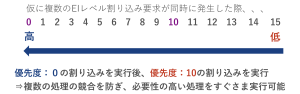 例として仮に割り込み優先度0と10の割り込みが同時に発生したとすると、優先度:0の割り込みを実行後、優先度:10の割り込みを実行するといった流れになります。