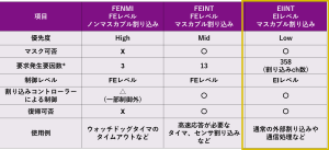 上記割り込みの違いですが、以下はRH850/F1KM-S1における、割り込み機能の比較表になります。