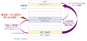 直接ベクタ方式に設定した際のプログラムの挙動として、まずは①発生した優先度に応じたハンドラアドレスにジャンプします。ここではjr32 _intp15が該当します。次に②割り込みのプログラムを実行するため、優先度15のプログラム、つまりintp15のコードを実行します。このプログラムが実行されたあとは、③元のプログラムの処理へと戻ります。