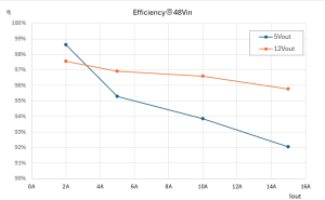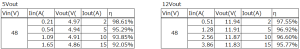 続いて効率です。入力電圧は産機、通信系でよく使用される48Vに固定とし、出力電圧、出力電流を以下条件で測定してみました。