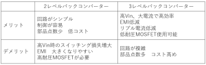 一方3レベルバックコンバーターは4つのMOSFETとフライングキャパシタCfly、インダクタL、出力コンデンサCoutで構成され、Vinが細かく分割された形となり、スイッチングノードはVin、Vin/2、GNDの3値で遷移することになります。Cfly間に印加される電圧はVin/2となり、2レベル時と比較してより低耐圧、低Rds、小型なMOSFETを使用可能となります。またインダクタのリプル電流も入力電圧が分割されることで小さくなり、インダクタを小型化することが出来ます。2レベルと3レベルの構成の違いによるメリット、デメリットを以下にまとめてみました。