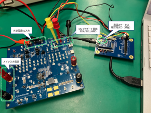 EVKボードの左端がメインの入力電源端子、上部が外部から入力される5V端子となります。GUIを起動すると、インターフェースボード上の通信ステータス確認用LEDが点灯しますので、この状態になるとレジスタ設定が可能となり、EVKボードを動作させることが出来ます。