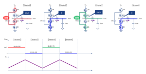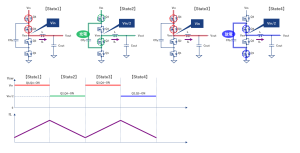 Dutyが50%以上の場合、VinとVin/2の間で動作することになります。まずState1でスイッチングノードより上側のQ3とQ4がONし、電圧はVinに引き上げインダクタ電流を増加させます。続いてSate2でQ2とQ4がONし、スイッチングノードの電圧をVin/2に戻してインダクタ電流を減少させます。CflyはVin/2になるよう充電されます。State1と同じ動作モードであるState3を経由して、State4ではQ1とQ3がONし、スイッチングノードがVin/2になるようCflyは放電されます。Duty50%未満の場合で説明した通り、この充放電をバランス制御により、スイッチングノードの電圧変化幅はVin/2に維持されます。