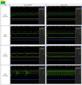 入出力条件は以下となります。Duty比の違いによるスイッチングノードの挙動を見たかったので、入力電圧を8.0V~24Vで振りました。