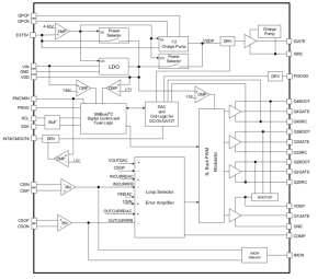 - プログラマブルスイッチング周波数:最大400kHz(スイッチングノードでは実効800kHz)