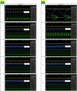 Vin=12V時の波形を見ると同じON区間でも電圧レベルが微妙に異なる波形が混在しています。2レベルでは見られない波形ですが、これは前述の3レベルの基本動作で記載したCflyの状態、この場合だとQ2-Q4がONする充電時と、Q1-Q3がONする放電時の挙動が見えているものと考えられます。