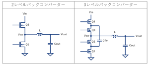 3レベルバックコンバーターの動作概要を説明します。まずは2レベルバックコンバーターと3レベルバックコンバーターの構成の違いを以下の図に示します。
